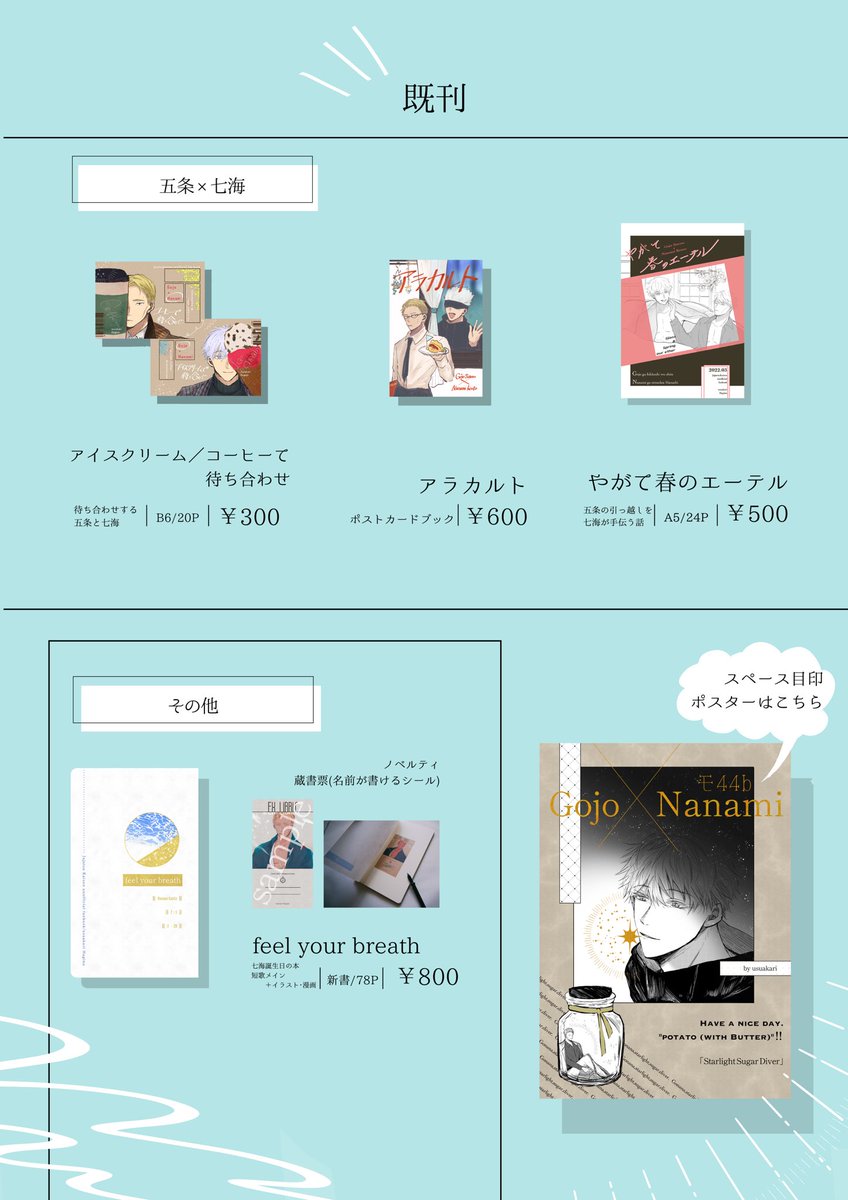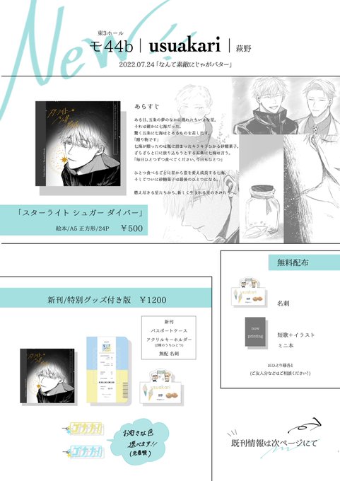 13 49 【7/24おしながき】東3ホールモ44b 新刊「スターライト シュガー ダイバー」¥500 (グッズ付き特別版¥1200) 絵本のような構成の正方形本です。※120話要素を含みます パスポートケースは合皮製で、中にカードポケット&ペンホルダーつきです(実物写真は後日ツリーにて) 以下新刊サンプルなど▼ 22/07/18 18:06