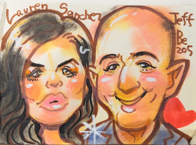 ジェフ・ベゾスさんと婚約者のローレン・サンチェスさん マウイ島の火事災害に145億円寄付と この人いまはアマゾンのCEOじゃないのね #似顔絵 #イラスト #千本ノック