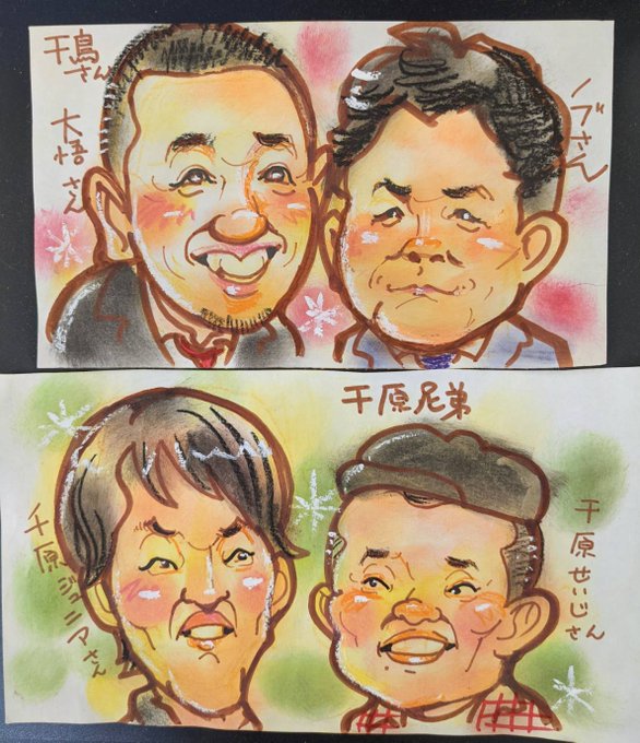 「ち」のつく有名人 千鳥さん 大悟さん ノブさん 千原兄弟 千原ジュニアさん 千原せいじさん 体形や顔の造作は大いに違うけど、すごく似てる千原兄弟さん #イラスト #千本ノック 238~241 #似顔絵