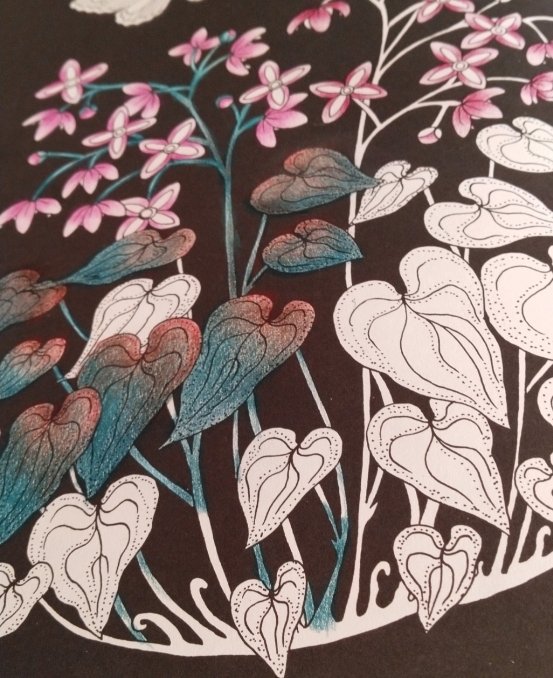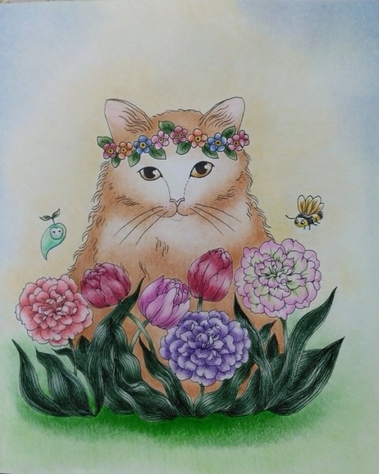 見開き完成です。 爽やかなグリーンを目指してましたが、だんだんと鬱蒼としてきました😅 ツリーハウスだからま、良いか🎶 そのグリーンを塗るのがとにかく楽しかったです。 #大人の塗り絵 #ポリクロモス #ネコの雑貨店と魔法のカギ