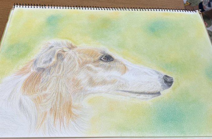 背景描けないのでダイソーのパステルを使って初めてやってみました。 改めて音海はるさんの凄さがわかりました。 この子は2年前天国へ行った大切な家族、ボルゾイの風雅です。色んなことを思い出し懐かしい気持ちになりました。 #音海はる さん #尊敬 #ボルゾイ #色鉛筆画 #色鉛筆画初心者