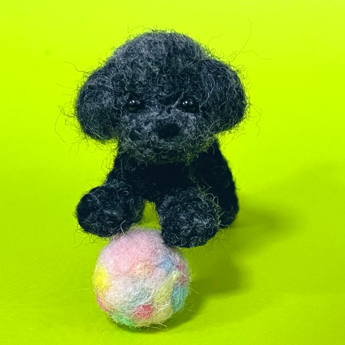 トイプーちゃん進捗。 とりあえず羊毛で目を入れてボールで遊んでる感じのポーズをつけてみました。 結論として、やっぱ刺し目の方がいい気がする。目に生気がない😨 #羊毛フェルト twitter.com/haguminu/sta…