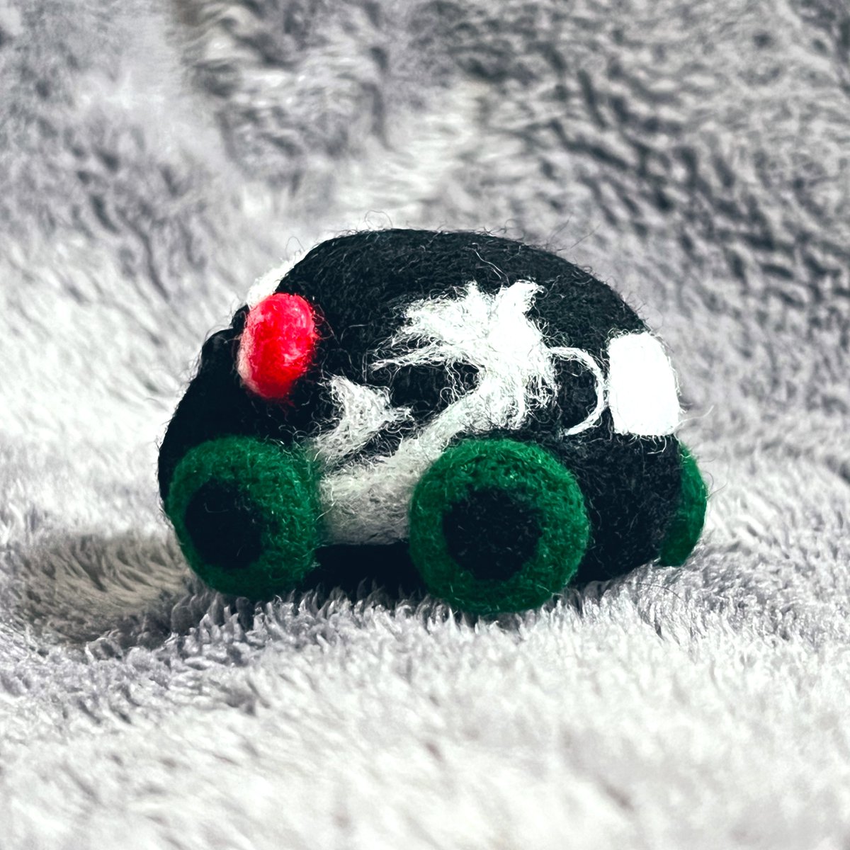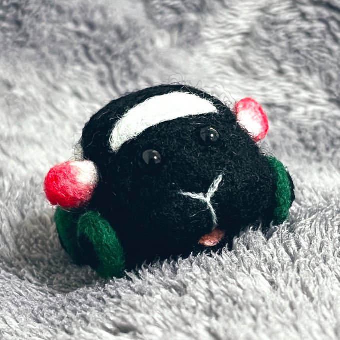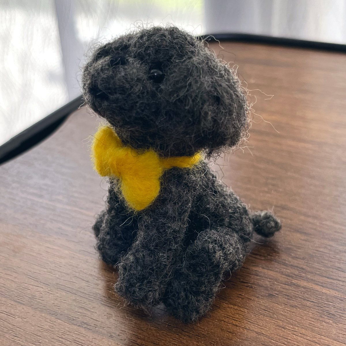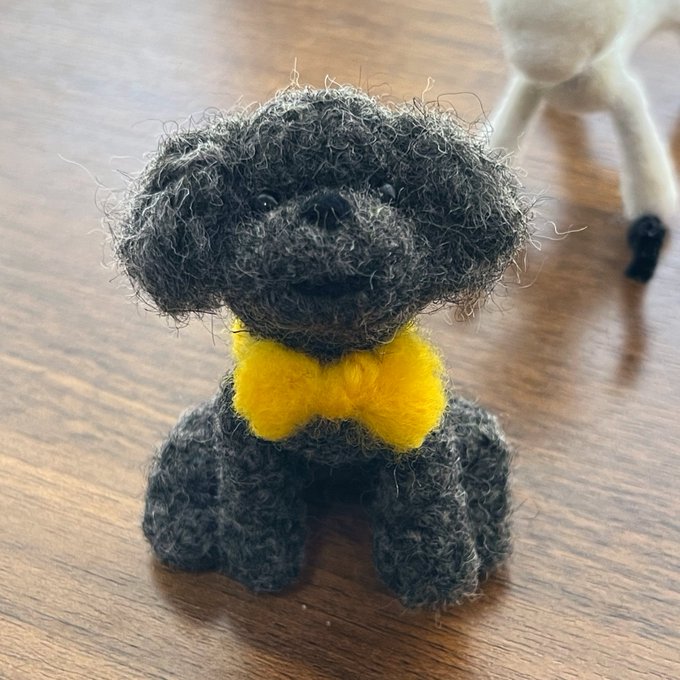 オーダーわんこ進捗。 黒い子が一体完成しました。 仮でリボン付けてみたけど、結構可愛い気がする。 茶色い子も(スプラ3のマッチングの合間等に)ボチボチ進めていきます。 #羊毛フェルト twitter.com/haguminu/sta…