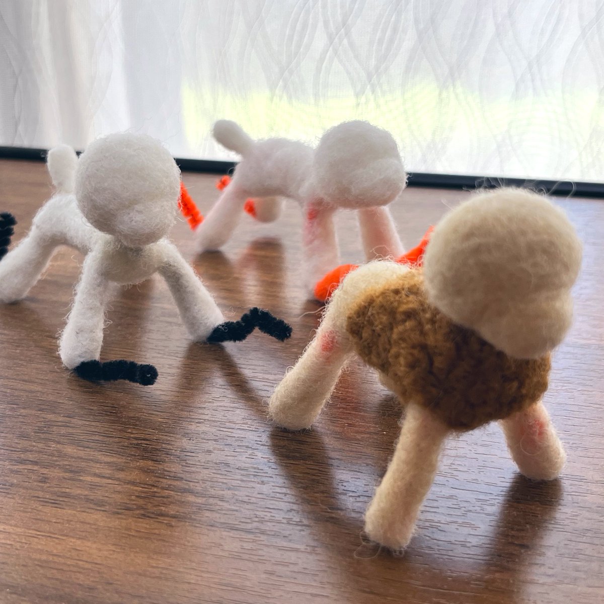 オーダーわんこ進捗。 4体出来ました。 が、足の長さや太さ等バラつきがあるので、最終調整入れて完成としたいと思います。 次はこの子達を入れるカゴを作らないとだー。 やった事ないけど作れるかしら?💦 #羊毛フェルト twitter.com/haguminu/sta…