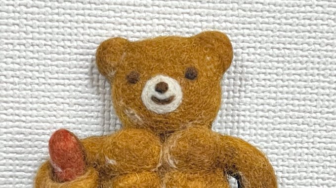 筋肉くまパン #羊毛フェルト 完成しました🐻💪 金具つけてキーホルダーにしたよ。 息子の水筒ホルダーにつけた☺️ ただの水でも気分はプロテイン! twitter.com/haguminu/statu…