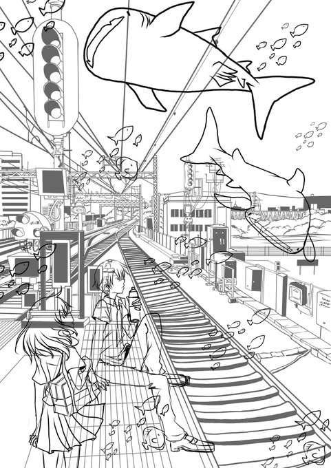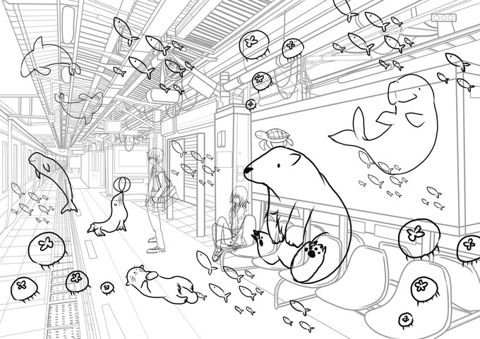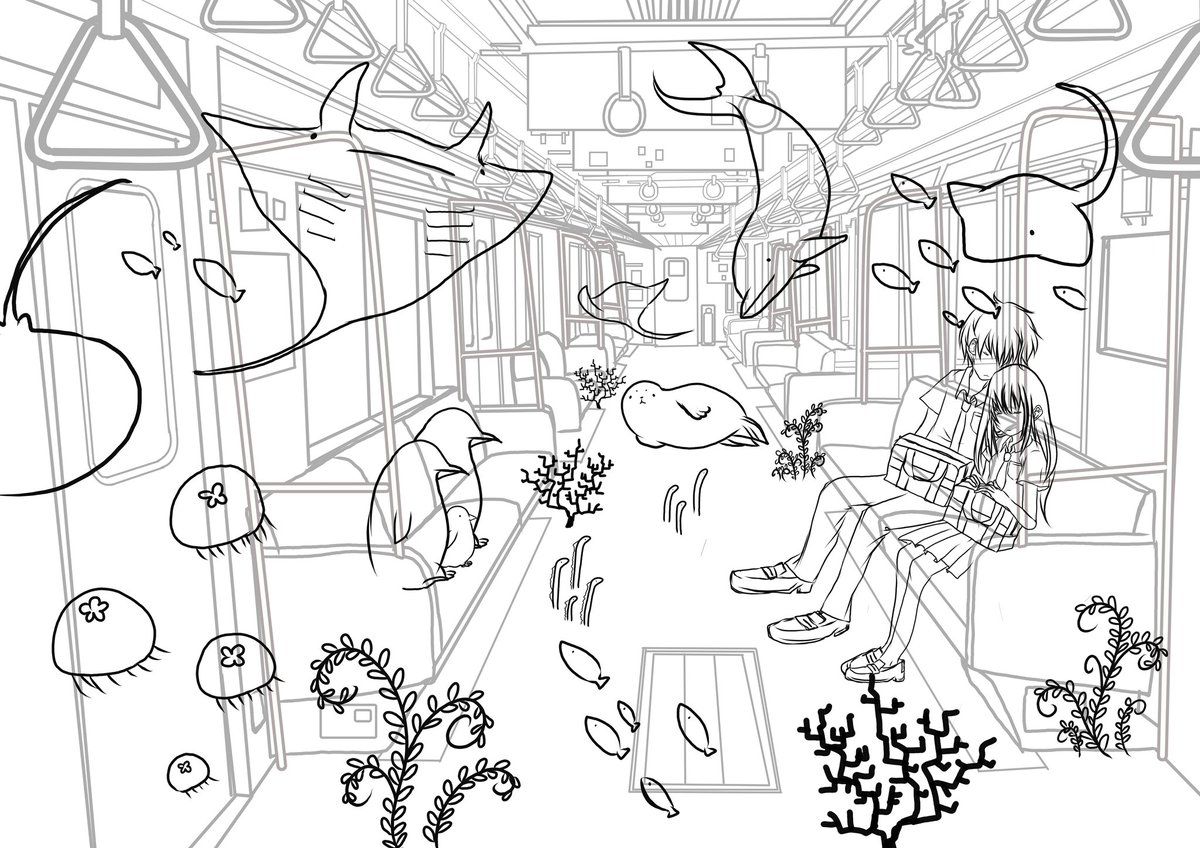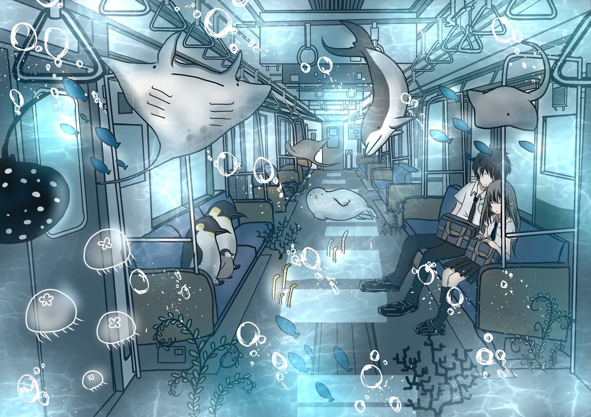 涼しさをあなたに⊂(`・ω・´)⊃バッ #イラスト #ポルカドットスティングレイ #私の絵柄が好みって人にフォローされたい #いつか超つよつよ絵師になるので今のうちに推しませんか #海 #絵 #電車