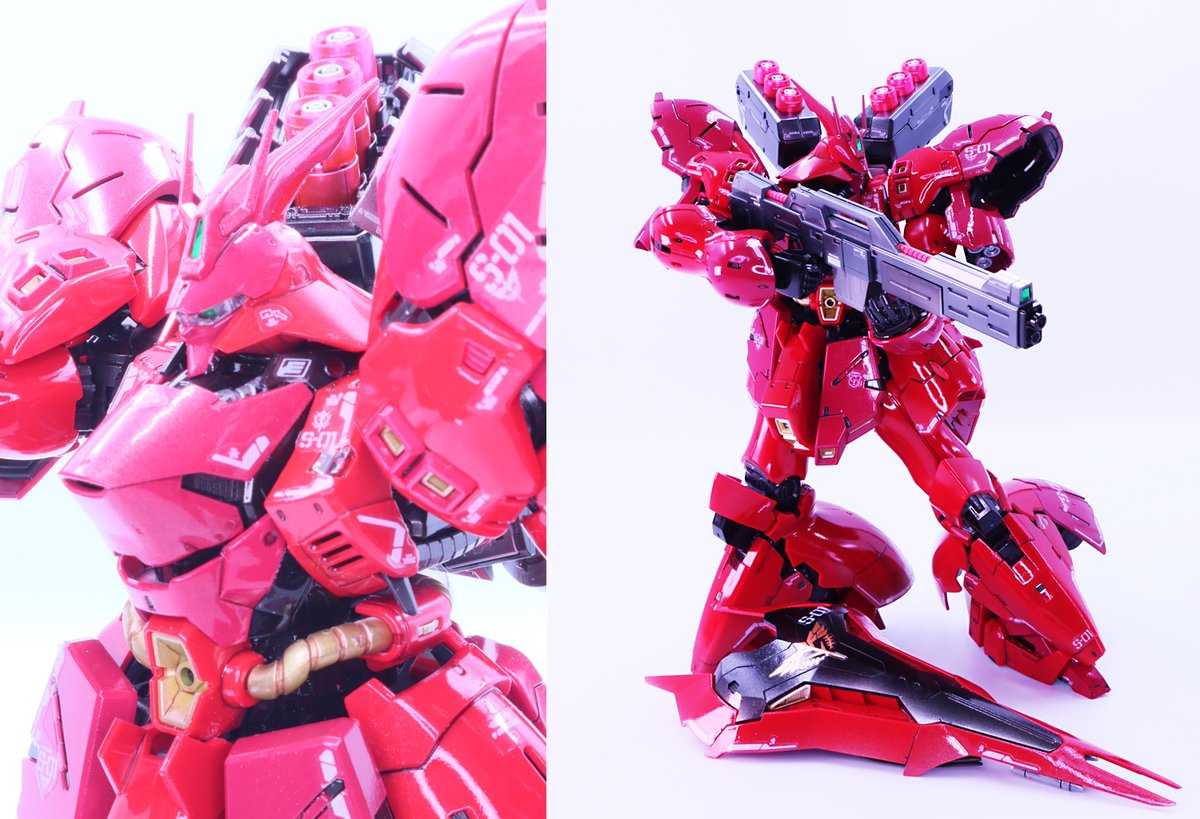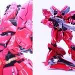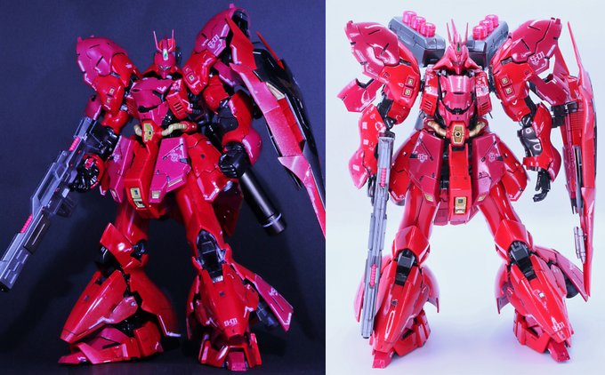 #ガンプラ #サザビー いくつか写真撮りました。 黒背景は箱絵ポーズ。やはり良いポーズですねカッコイイ! モノアイがクリアパーツに反射してツインアイになったのはご愛敬w 白背景はそれっぽいのを何パターンか。 νガンダム塗装したら絡みの写真も撮りたいと思います。