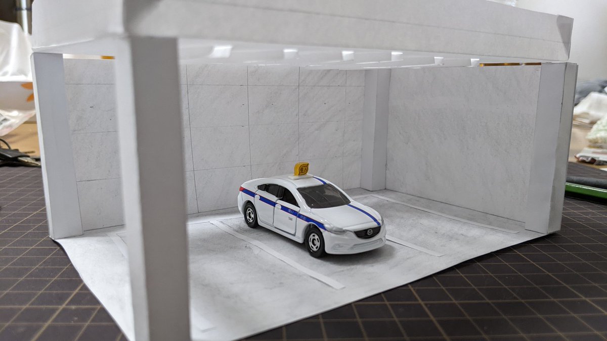 画用紙を切り貼りして、地下駐車場の一角のような雰囲気。 パイプとかを這わせれば完璧かな? #トミカ #ペーパークラフト #駐車場
