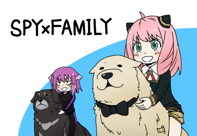 スパイと殺し屋とエスパーが家族になる作品。正月関係ないですが、アーニャとボンドの組み合わせが可愛くてつい…📦 実際に乗ったりすると犬の背骨を痛めるので真似しちゃダメです。 #SPYxFAMILY