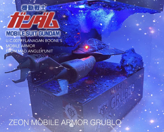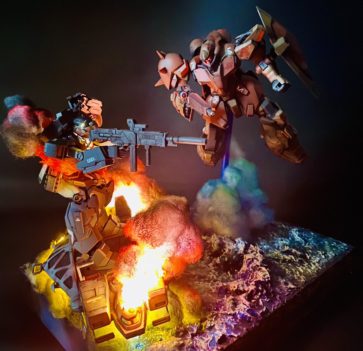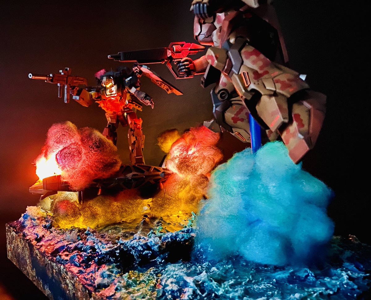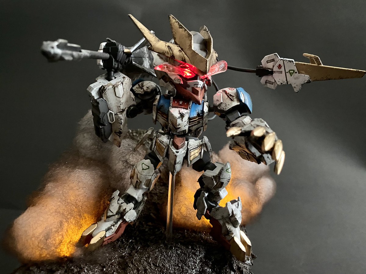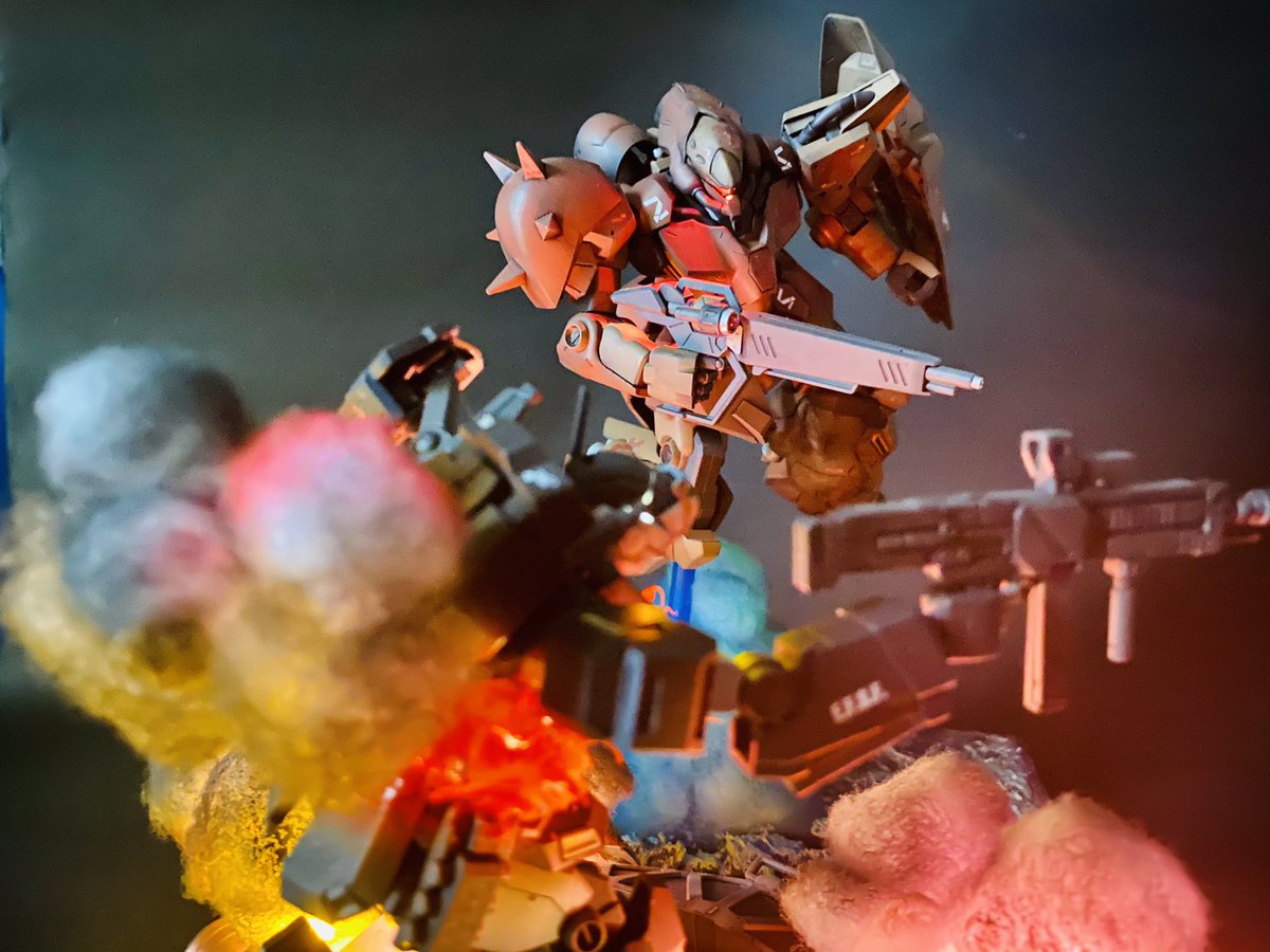 先日の変わったグラブロがこうなりまして💦 照明を落として作品だけ見てみると、綺麗な演出ができて、これはこれで満足です😁 #ガンプラの画像を貼るとRTされると聞いて #ガンプラ改造 #ガンプラは自由だ