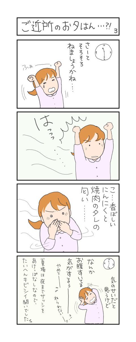 ニンニクと焼肉のタレの匂いっていいよね。 でも夜中はちょっと厳しいよね💦 お腹すいて眠れなくなるじゃん⋯? #焼肉のタレの匂い #夜中はやめて #漫画が読めるハッシュタグ #マンガが読めるハッシュタグ #4コママンガ #4コマ漫画 #コミックエッセイ