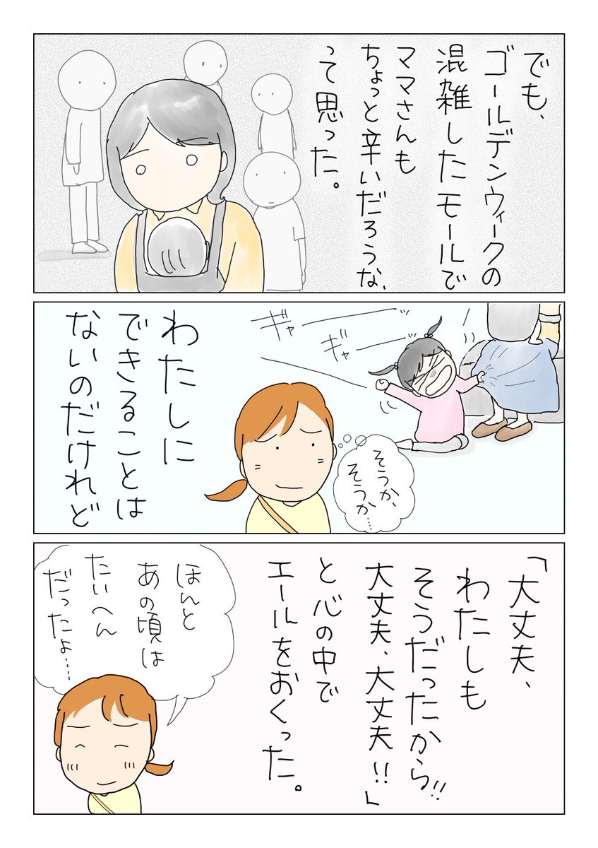 子供が泣きやまないとき、自分も泣きたかった。特に外出中はどうしようもなかった。 でもみんな一緒だから、大丈夫!気にしない、気にしない。 子供はあっという間に大きくなっちゃうからね。 #漫画が読めるハッシュタグ #コミックエッセイ #泣きたい時もある