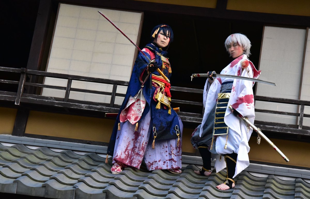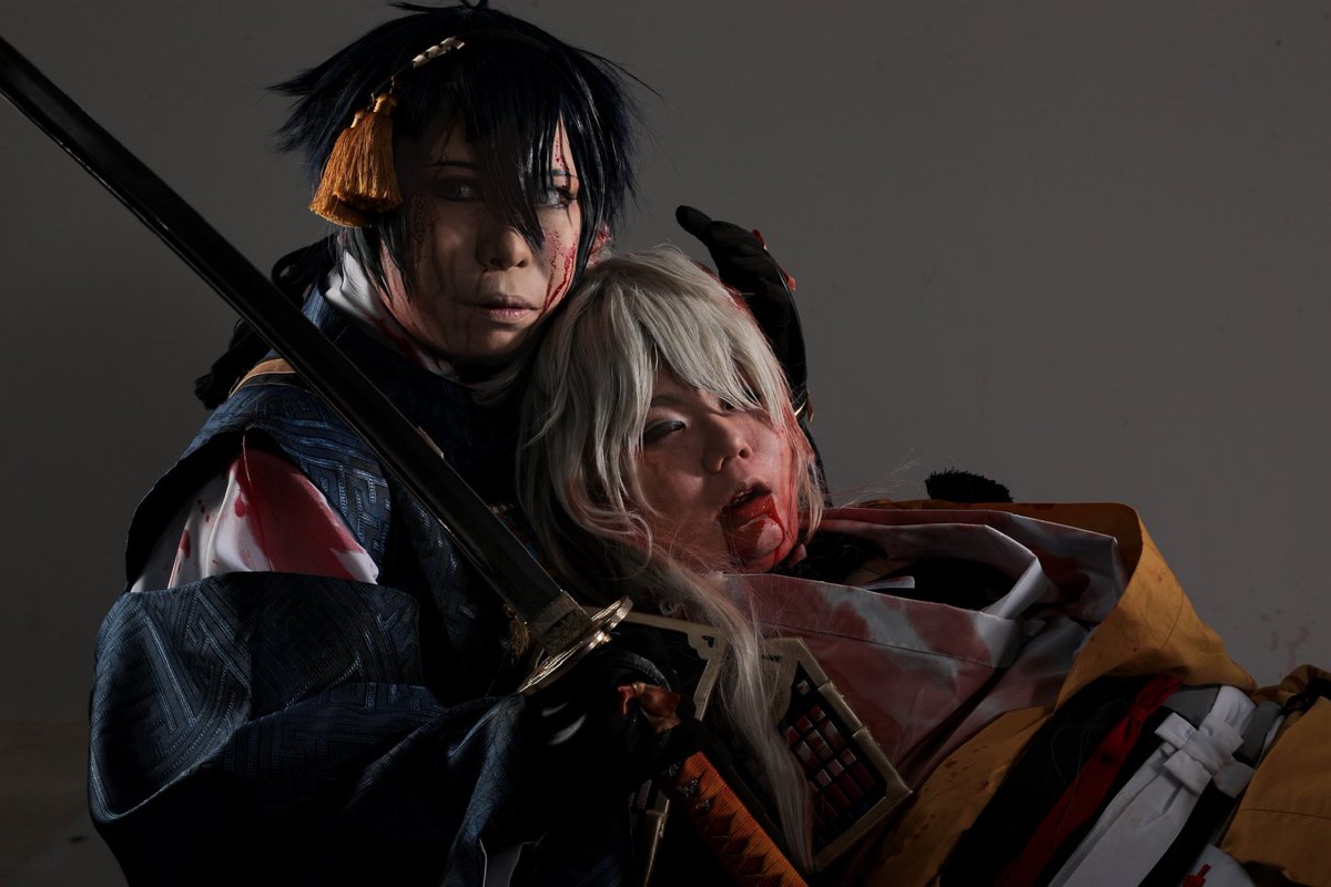 ⚠️cosplay/血糊⚠️ 三日月:倶摩さん(@kuma3cos) 鶴丸:Kiraluさん(@nyarukosanchi ) #鴨コス #彦根オープンセット #かざみふぉと@,cos