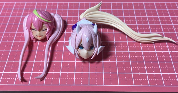 余ったジェネの髪勿体無いから髪の内側と朱羅のシリーズの頭部基部削って埋め込んで余ってる九尾のツインテを 隣のは丸々余った武装頭どうしようかなって思案中のやつ #メガミデバイス