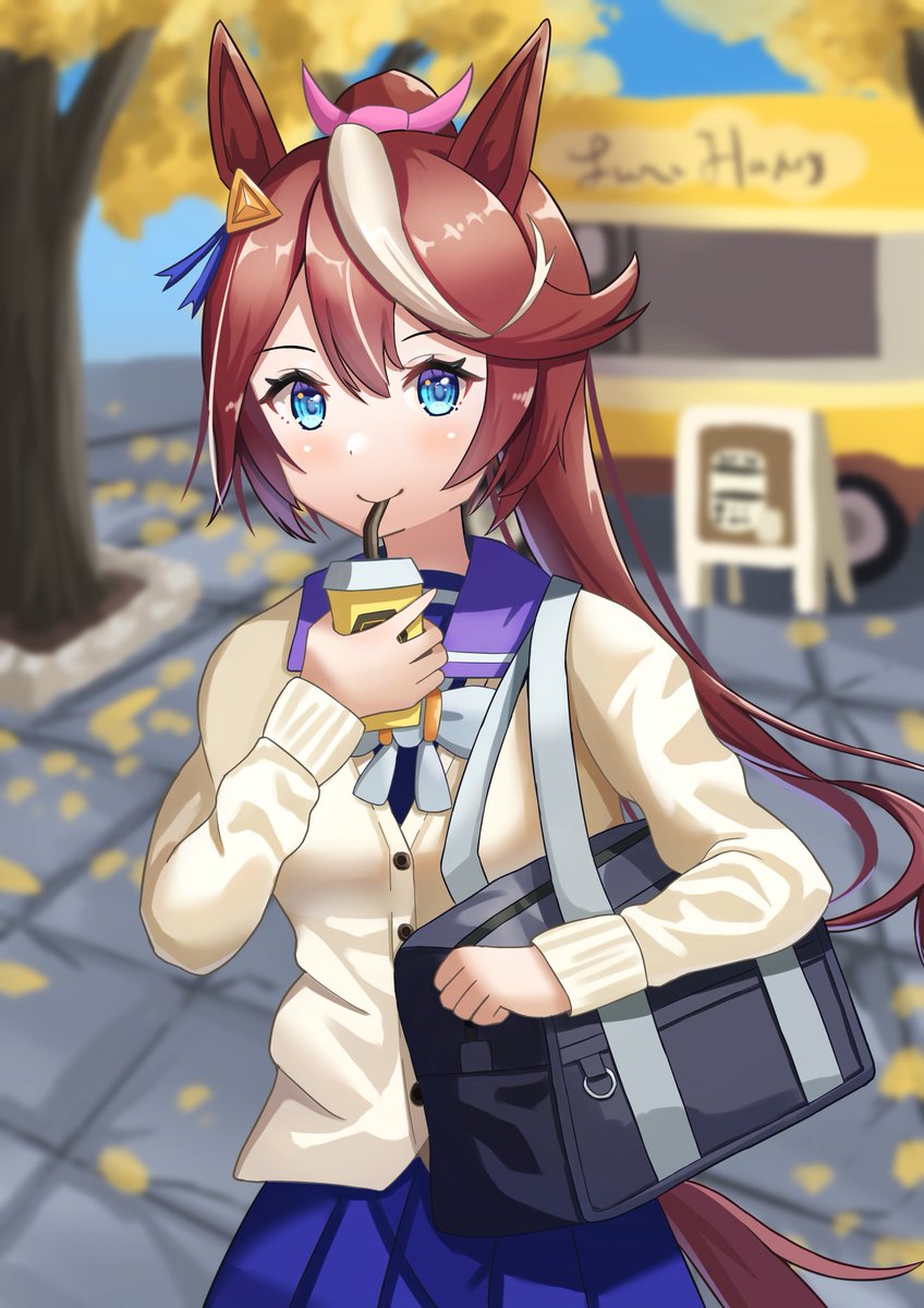 肌寒くなってきたので、秋っぽいテイオーを描いてみました。制服にカーディガンあわせるの好き。 #ウマ娘 #トウカイテイオー