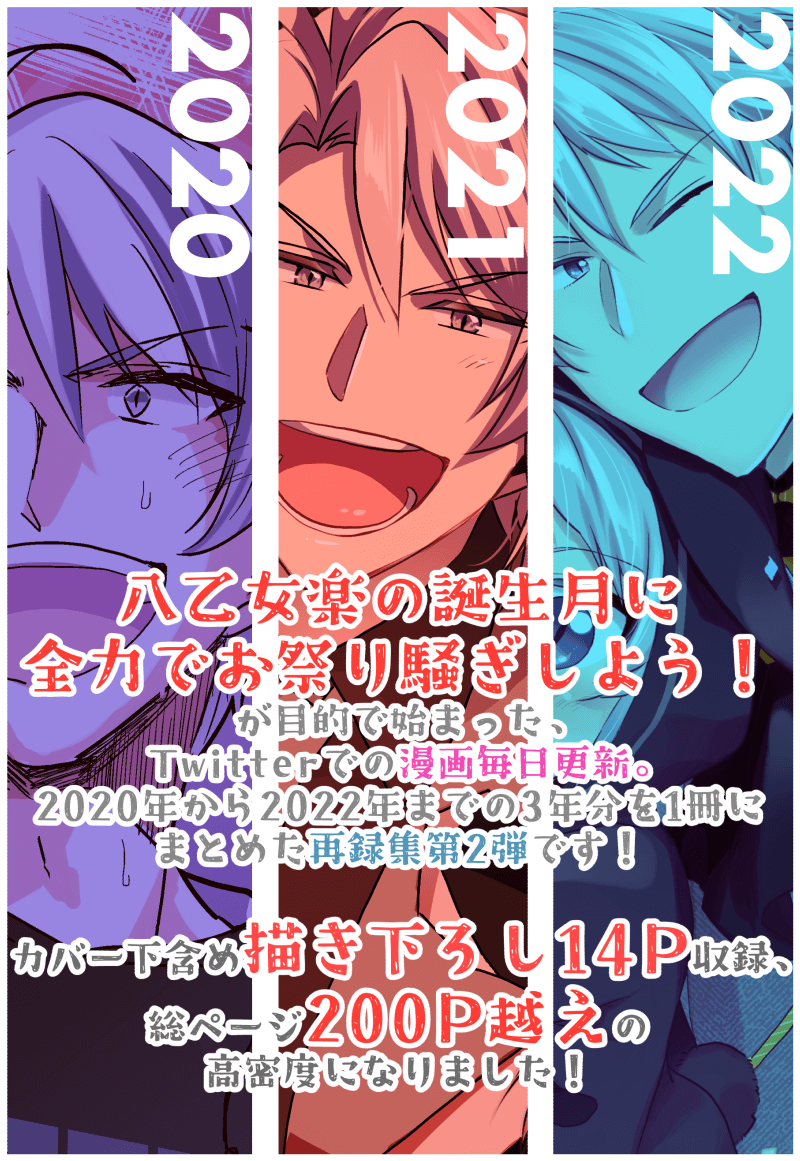 34 138 【新刊告知】 9/18(日)トプステ30 【ヤ39a:甘飴細工】 『八乙女楽月間再録集2』イベント頒布価格1500円 2020年~2022年の8月の毎日更新をまとめた再録本です! 表紙カバー帯付、描き下ろしありの206Pです🌹よろしくお願いします~! pixivサンプルと書店委託はリプ欄へ↓ 22/09/14 23:07
