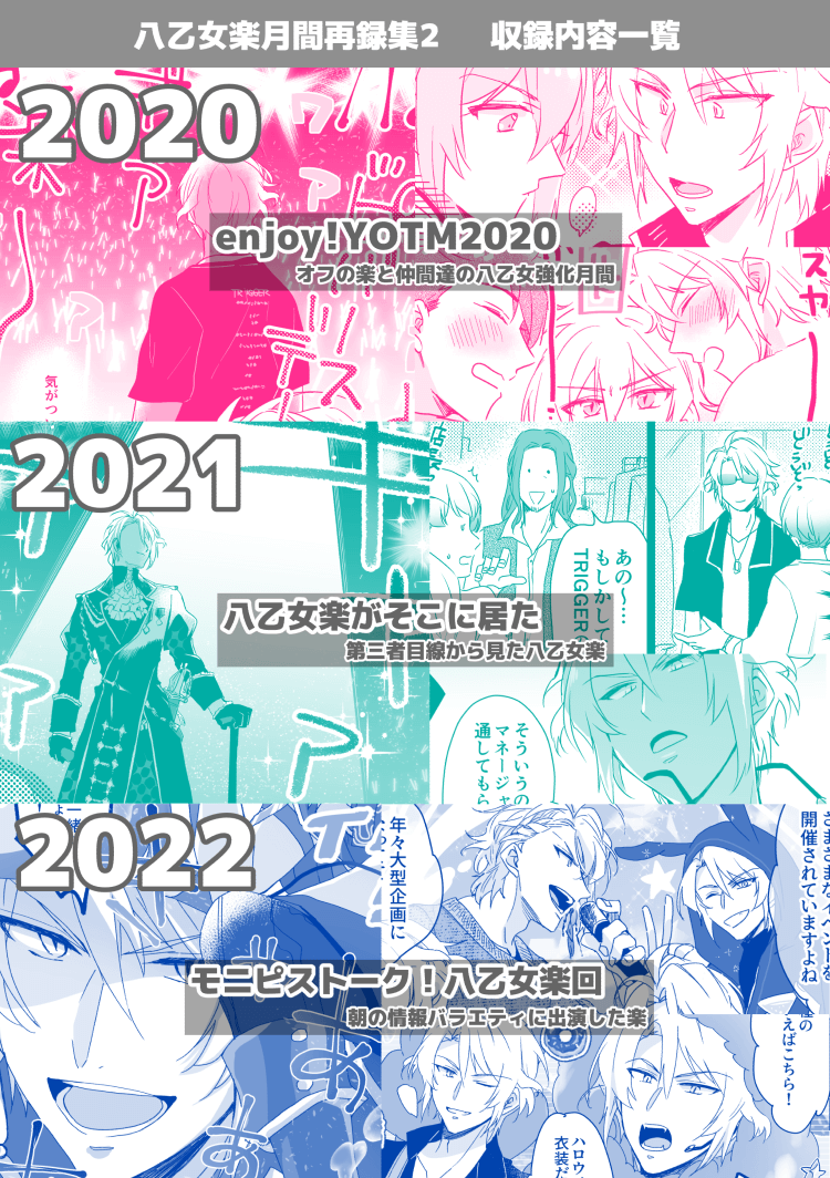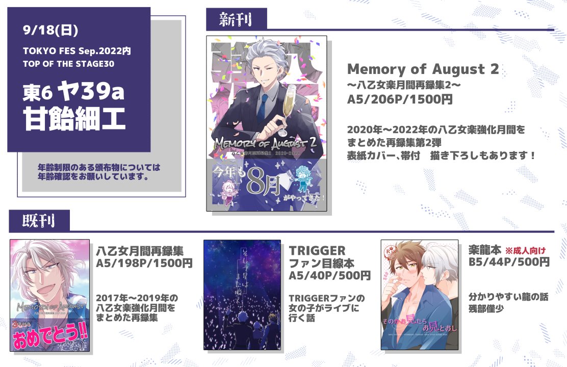 【新刊告知】 9/18(日)トプステ30 【ヤ39a:甘飴細工】 『八乙女楽月間再録集2』イベント頒布価格1500円 2020年~2022年の8月の毎日更新をまとめた再録本です! 表紙カバー帯付、描き下ろしありの206Pです🌹よろしくお願いします~! pixivサンプルと書店委託はリプ欄へ↓