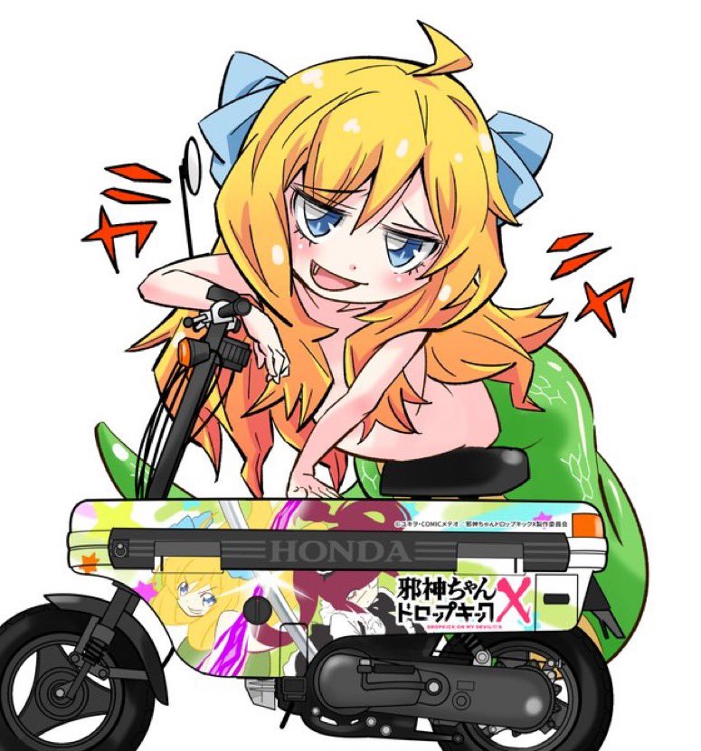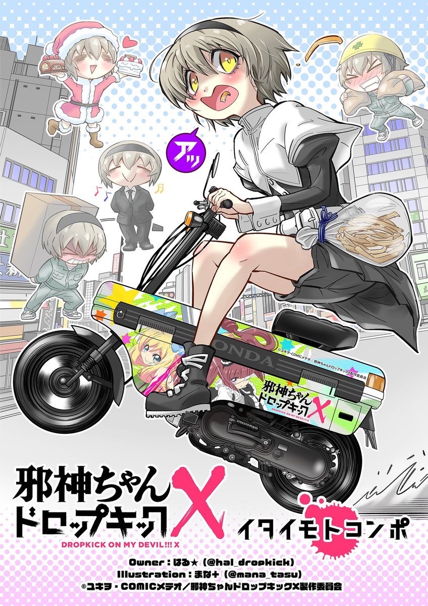 #邪フェス に向けて製作中の痛モトコンポ、完成に先駆けてまな+( @mana_tasu )さんに描いて頂いたイメージイラストを公開します!邪フェス当日はポスターにして展示します!ぜひ見に来て下さい。そしてこのイラストも製作委員会様の監修済なのです。 #邪神ちゃんドロップキック #モトコンポ