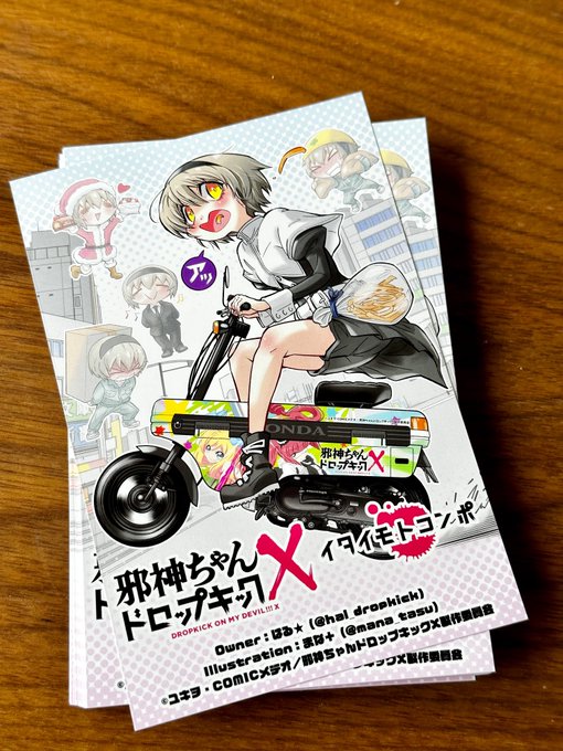 まな+さん(@mana_tasu )作の素敵イラストをポストカード化しました!#邪フェス に持って行きます。 CFのルール上販売はNG、交流目的のみ許可を貰いましたので無料です。しかしどうやって配ろう…。 #邪神ちゃん痛モトコンポ #邪神ちゃんドロップキック #モトコンポ