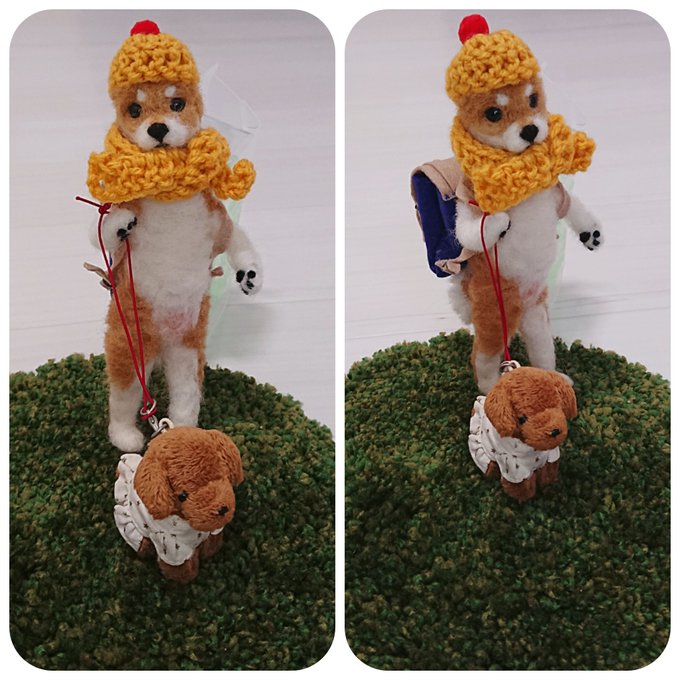 1 3 暑い暑い真夏に☀️ 真冬コーデでプードルちゃんと お散歩してる柴犬くんw #羊毛フェルト #柴犬 #真夏 #真冬コーデ 20/08/30 08:58