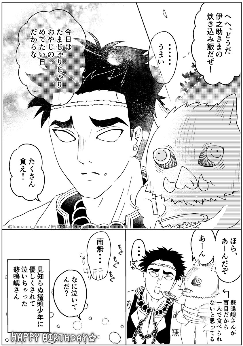 伊之助ちゃんが悲鳴嶼さんをお祝いする漫画🐗 悲鳴嶼さん誕生日おめでとう🎉(1/2)
