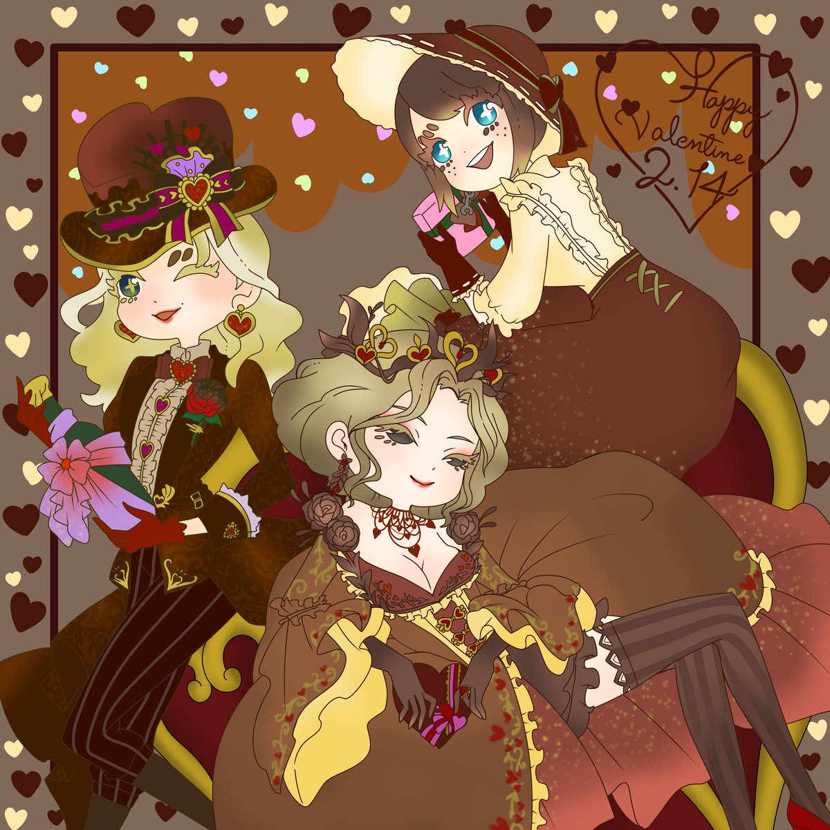 💕✨ハッピーバレンタイン✨💕 大好きな衣装をチョコレート風にアレンジしました!!(こういう衣装ほしい…)🍫🍰🍩🧁 女の子の皆誰にあげるのかな~😌✨ 自分は大好きなエマちゃんから貰いたいです🤤🙏💓 #荘園バレンタイン #第五人格イラスト