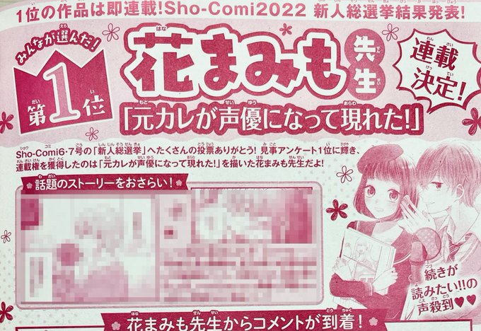 🌷お知らせ🌷 発売中のSho-Comi11号に、新人総選挙の結果が掲載されています!なんと皆様の応援のおかげで、1位をいただくことができました😭本当に本当にありがとうございます!楽しんでいただける連載にできるよう、頑張ります✨