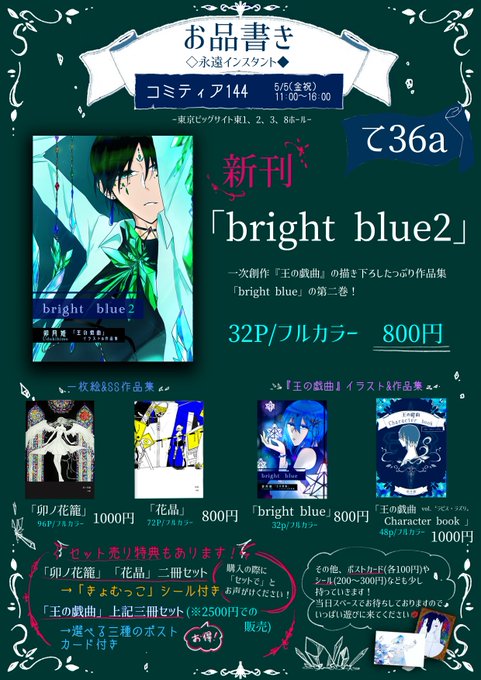 5/5(金祝)のコミティア144のお品書きです💎 【て36a】!新刊もあります‼️ お品書きにもちょっと書いてるセット売りの特典(画集のセットにはシール、王の戯曲セットには選べるポストカード)のビジュアルは当日のお楽しみになってます!ぜひもらってやってください💋 #コミティア144 #COMITIA144