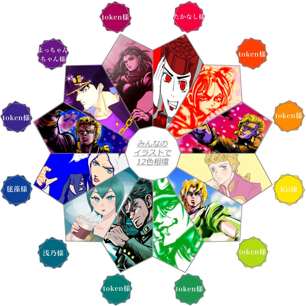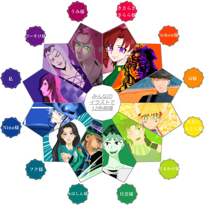 ジョジョキャラで十二色相環!! 皆様御参加ありがとうございました💖 皆様の素敵なイラストでこの企画を 無事に出来たことが本当に嬉しいです✨ 本当にありがとうございましたッ!! #みんなのイラストで12色相環