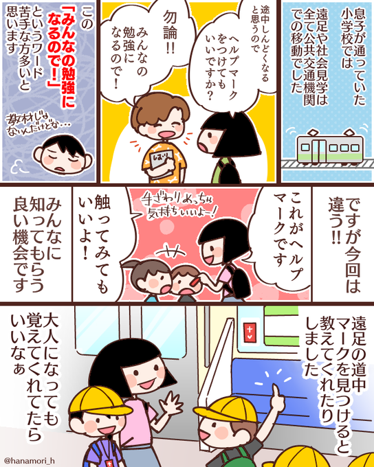 ヘルプマークの話、最後にもうひとつ。学校での校外活動の際は許可を得てつけていってました。子供たちに説明する時は触ってもらうようにしてます。手触りがすごく気持ちいいのと覚えてもらいやすいから(コロナ前の話です) #コミックエッセイ #漫画が読めるハッシュタグ