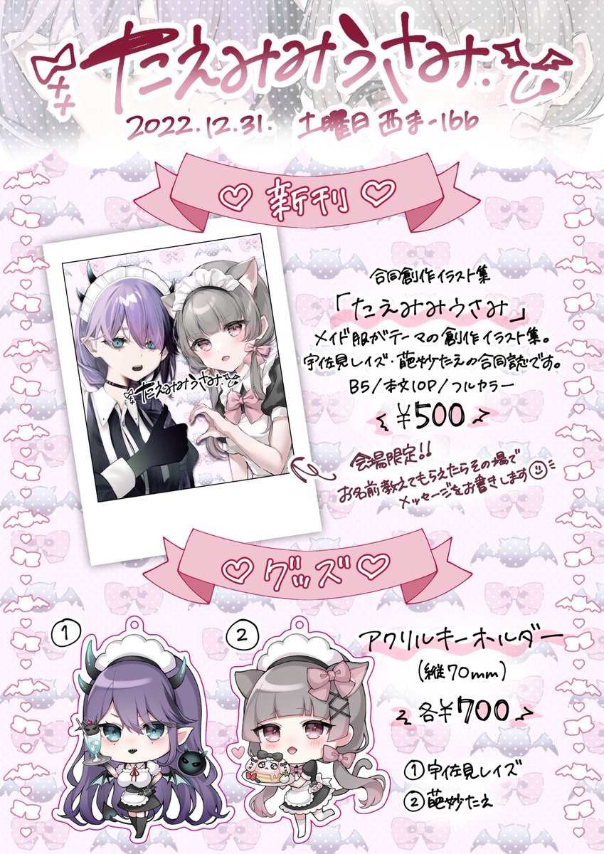 【💖C101 お品書き💖】 12/31(土) 2日目「西ま-16b」 たえみみうさみにてお待ちしております🎶 葩妙たえ(@hanatae_tae)と宇佐見レイズ(@laze0220)の合同です!! よろしくお願いします! #C101 #お品書き