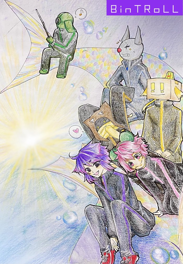 かっこいいのが描きたくて、ビントロメンバーに武器を持たせてみた! みんちゃんの座高がめちゃ長くなってしまったけど、そこはご愛嬌w #bintrollFA