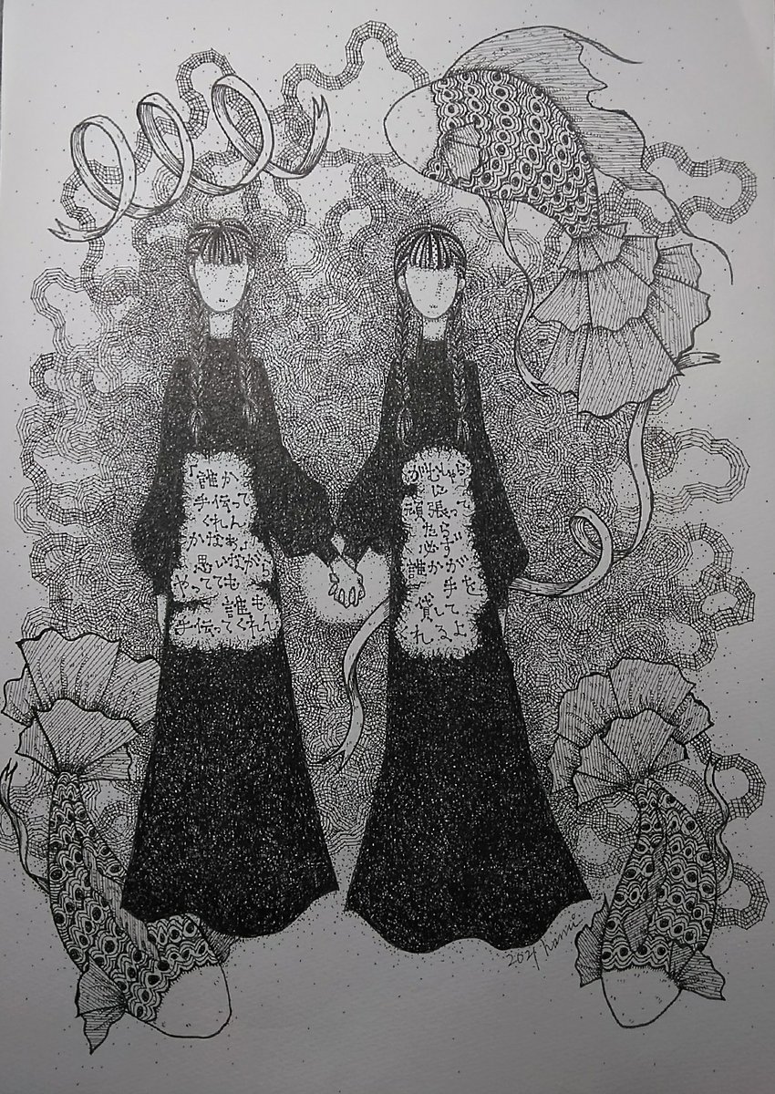0 3 5月くらいに描いた絵。 #ペン画 #アナログ #絵と言葉 #三編み #かわい絵 #双子 21/08/21 08:21