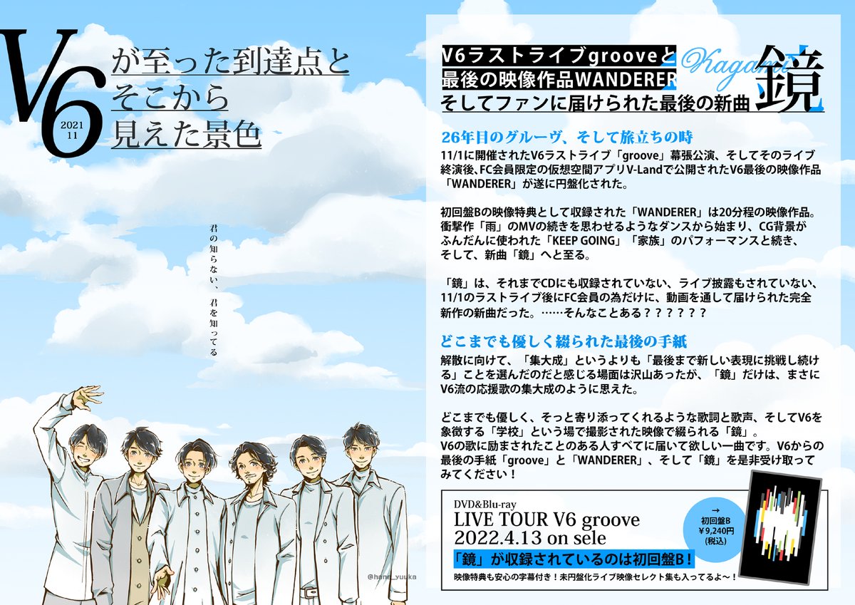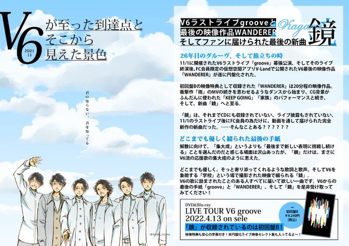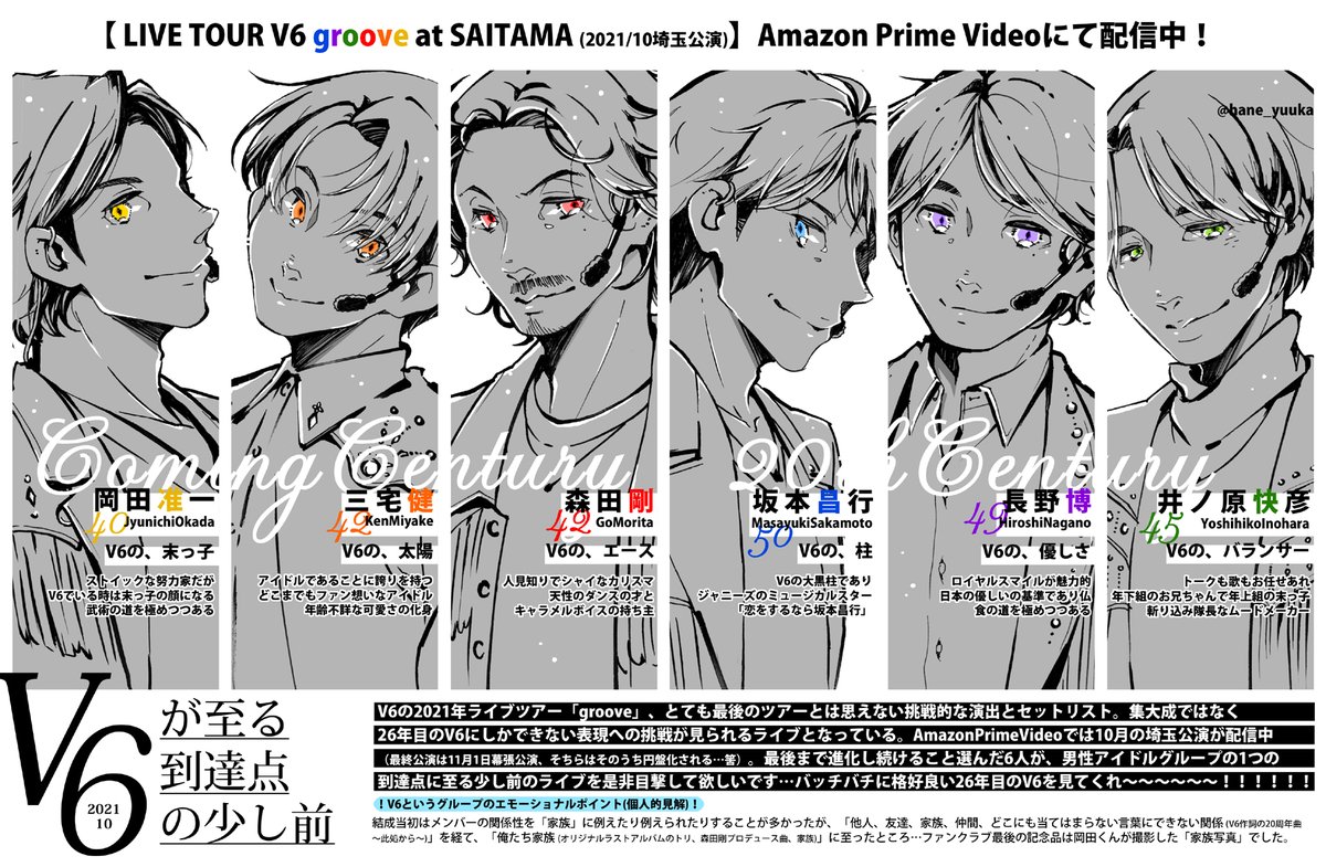 フォロワーにアマプラで配信中のV6の2021ライブツアー「groove」埼玉公演(11/1の幕張最終公演ではない、セトリは一緒)を見て欲しすぎて描きました。 まずは最初の3曲からで良いので何卒…ラストツアー感が無い攻めまくってる26年目のV6に出会ってくださいお願い致します! amazon.co.jp/gp/video/detai…