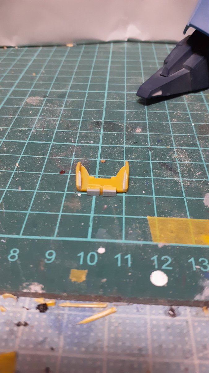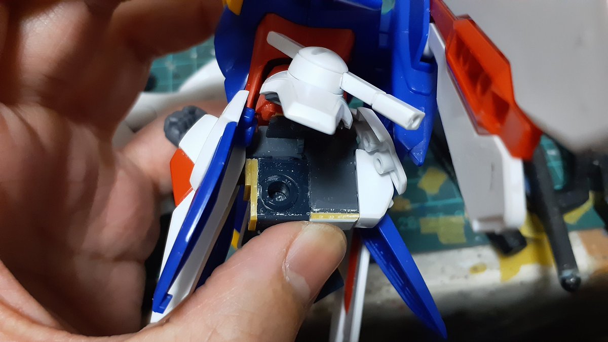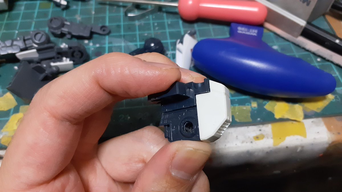 古いMGの武器持てない問題。 手のひらに穴を開け、穴の幅に合わせたプラ板をグリップに接着し保持力アップ! ついでに指も切り離し後、角度を変え再接着しより自然な形状に変更 #ガンプラの画像貼るとRTされると聞いて #ガンプラ好きと繋がりたい