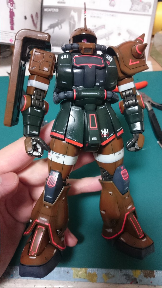 イライジャ専用ジン、武装とフレームの塗装完了! フレームは2色のメタリックで表現。 デカールワーク前の組み上げ確認。 #MGモビルジン #ガンプラの画像を貼るとRTされると聞いて #ガンプラ好きと繋がりたい