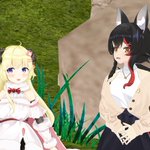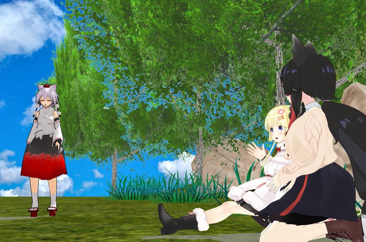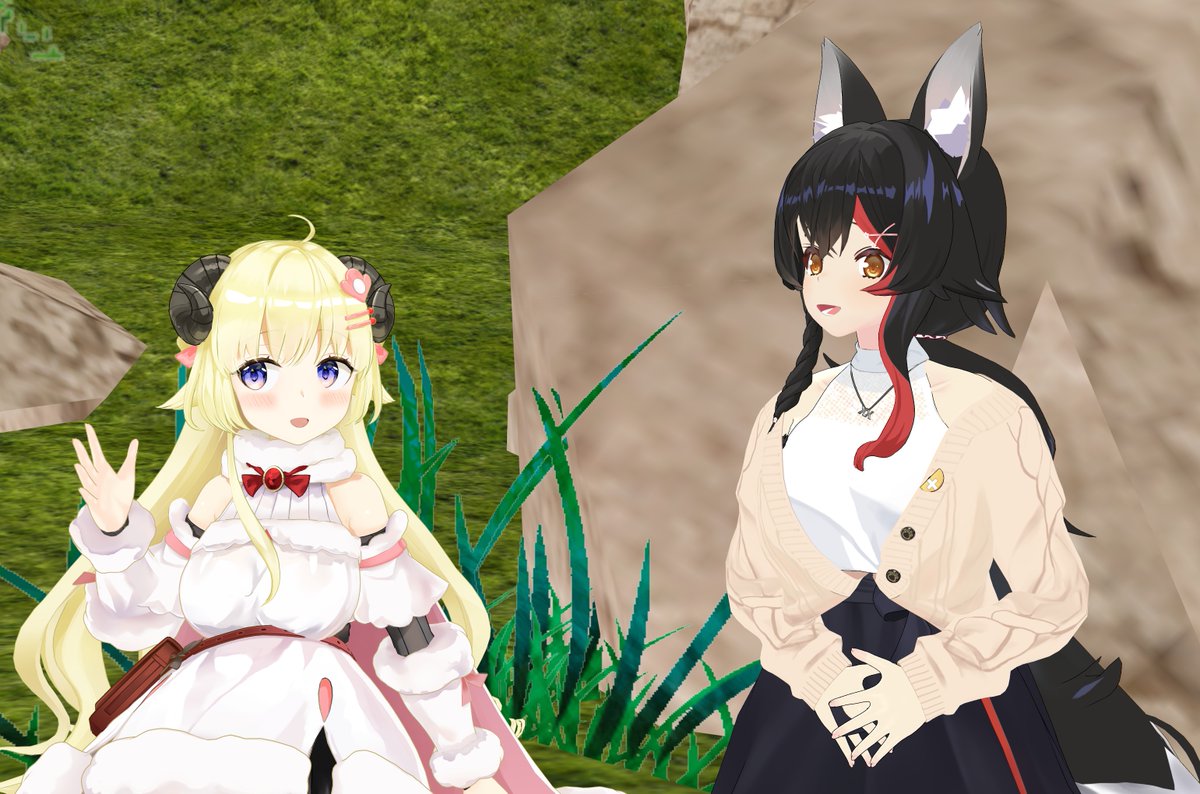 3 21 #みおーん絵 #つのまきあーと 「今度占いの館にお邪魔してもいいですか?」わため 「いいよ~。いつでも待ってるよ。あら?」ミオ 「はぁ・・・休出で12連勤はしんどいよぉ・・・」椛 お借りしたモデル ・ホロライブ公式 角巻わため ・戯時式大神ミオ ・えと式犬走椛 ・NuKasa式山の中の洞窟前 22/01/29 23:57