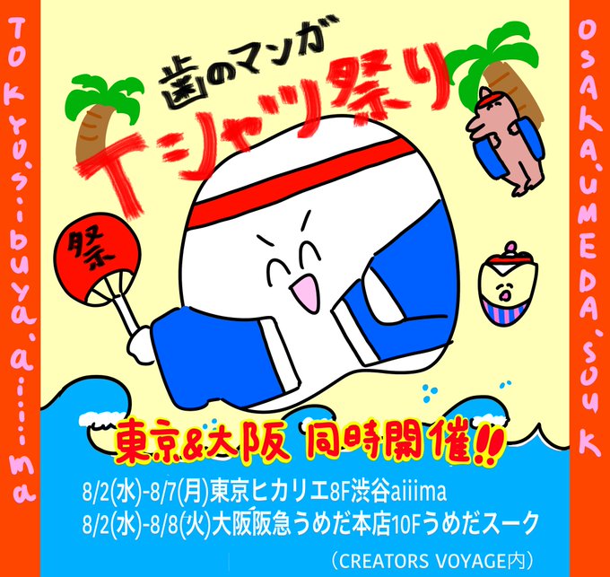 【おしらせ】 歯のマンガTシャツ祭りをやります!今まで歯のマンガで販売してきたTシャツをどーんと販売します。グッズもたくさんだします!今回は東京渋谷aiiimaと大阪うめだ阪急と2ヶ所同時に開催です!東京と大阪のみなさんこの夏是非お越しください!