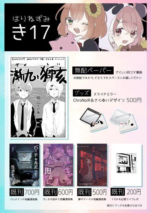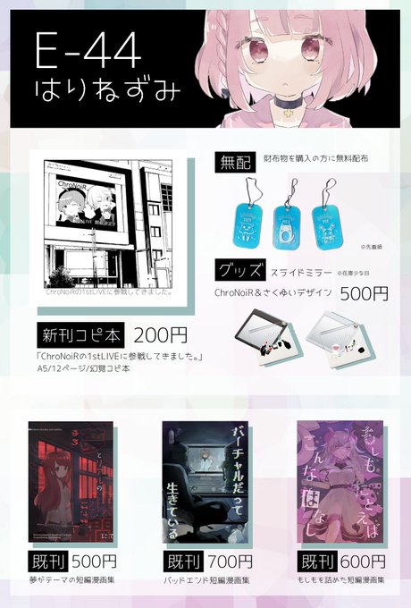 #にじそうさく06 のお品書きです! 新刊はくろのわがアイドルしてる世界線のライブレポ漫画です。 他にも既刊やグッズも持っていきます~! 当日は「E-44」でお待ちしております。よろしくお願いいたします。 pixivにも載せております。 pixiv.net/artworks/98072…