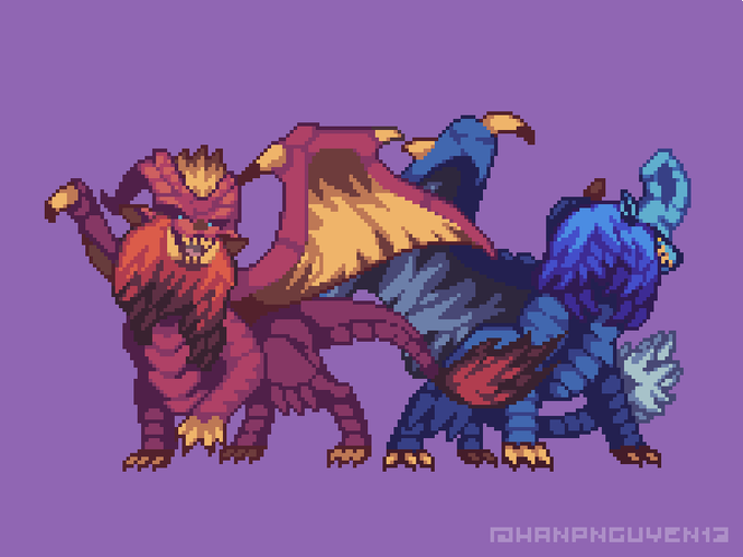 Finished the power couple today #MonsterHunterWorld #MonsterHunter #pixel #pixelart @PyxelEdit #teostra #lunastra