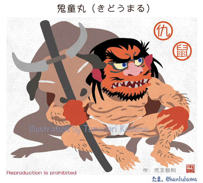 1 6 🎃おばけ・妖怪・もののけ図鑑👻Yokai 「鬼童丸(きどうまる)」 出没場所:雲原、鞍馬 酒呑童子に拐われた女の一人が正気を失い鬼童丸を産んだ 生まれなからに歯は生え揃い、幼少から石で獣を倒し食べた 牛の皮をかぶり父酒呑童子の仇頼光を待ち伏せした #妖怪 #イラスト #Illustration #Yokai 22/08/10 16:44