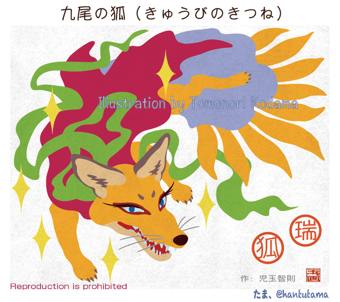 2 6 🎃おばけ・妖怪・もののけ図鑑👻Yokai 九尾の狐(きゅうびのきつね) 出没場所:山、宮廷 異称類縁:九尾狐狸、玉藻前 古代中国では邪を避け明君の代を示し(史書や『山海経』他)、古代日本でも神獣とされ、 『封神演義』の影響から近世以降は悪狐とみなされた #妖怪 #イラスト #Illustration #Yokai 22/10/13 20:09