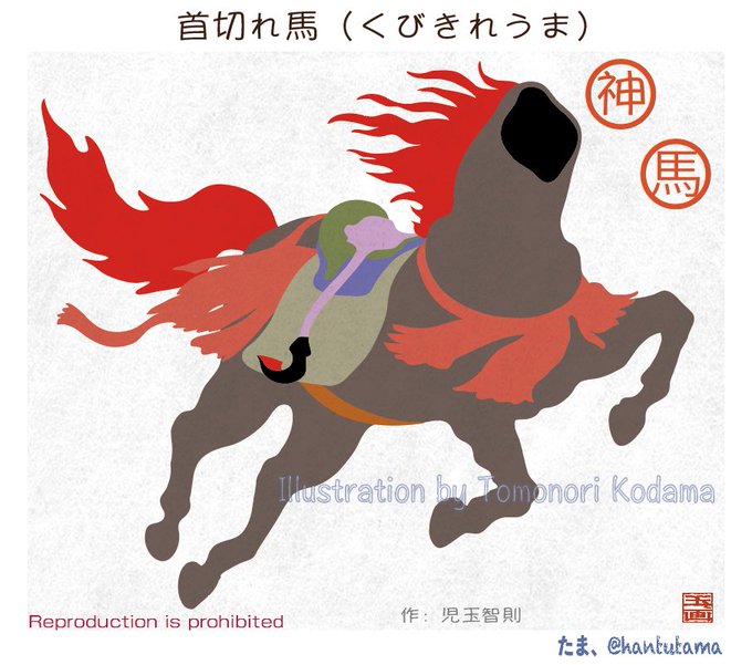 🎃おばけ・妖怪・もののけ図鑑👻Yokai 首切れ馬(くびきれうま) 出没場所:本州四国、辻、ウマミチ 異称類縁:首無し馬、夜行さん、七人童子 神霊が乗る首無し馬。馬のみ走る所もある。 遭遇は不吉。愛媛玉川町では縁起が良い。徳島祖谷山では節分の夜に走る。 #妖怪 #イラスト #Illustration #Yokai