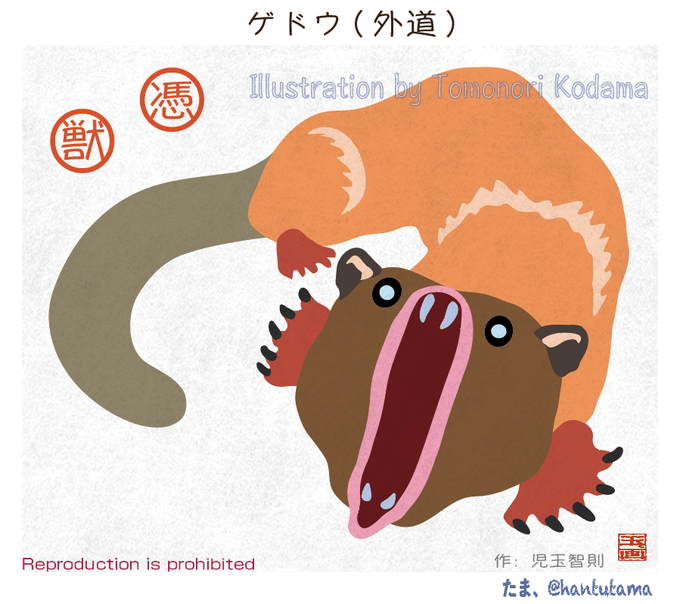 2 5 🎃おばけ・妖怪・もののけ図鑑👻Yokai ゲドウ(外道) 異称類縁:犬神、憑き物 口が縦に裂け、モグラに似ている。 飼えば家は繁栄。飼い主には見える。小豆を食す。 女子が生まれると増え嫁ぎ先について行く。 家が衰えると人に憑き家は滅ぶ。 #妖怪 #イラスト #Illustration #Yokai #Japanese #monster 23/03/24 22:09