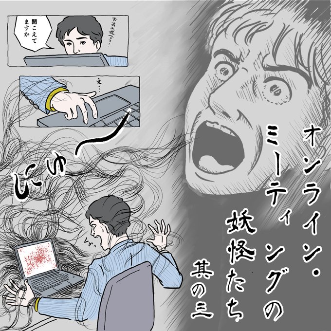 オンライン・ミーティングの妖怪たち 其の三 あなたのパソコン画面に現れる恐ろしい妖怪たちをご紹介いたします。 絵と文 塔 重五 #漫画 #まんが #マンガ #イラスト #インスタ漫画 #あるある #オンライン #zoom #リモートワーク #テレワーク #妖怪 #日常漫画
