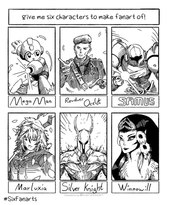 #SixFanarts #SixFanartsChallenge with Mega Man, Young Revolver Ocelot, Samus, Marluxia, Silver Knight and Winnowill.