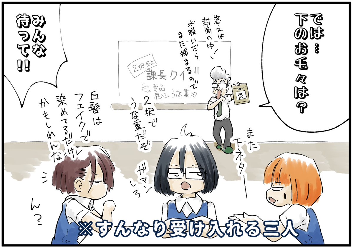 創作漫画・三匹のOL “課長クイズ” お楽しみください💞 #創作漫画 #漫画が読めるハッシュタグ #4コマ漫画 #ムダ毛 #うなぎ