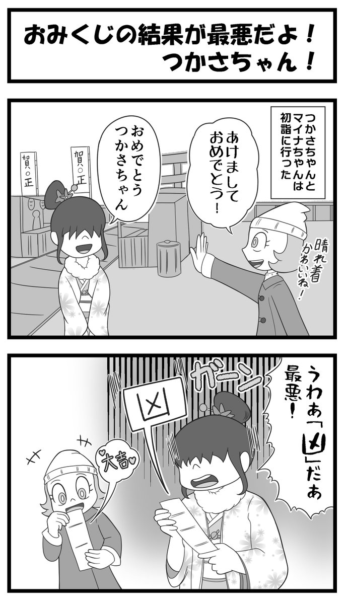 1 2 「おみくじの結果が最悪だよ!つかさちゃん!」 #プラス思考のつかさちゃん #漫画が読めるハッシュタグ #5コマ漫画 #ポジティブ漫画 #新年おみくじ 22/01/01 12:00