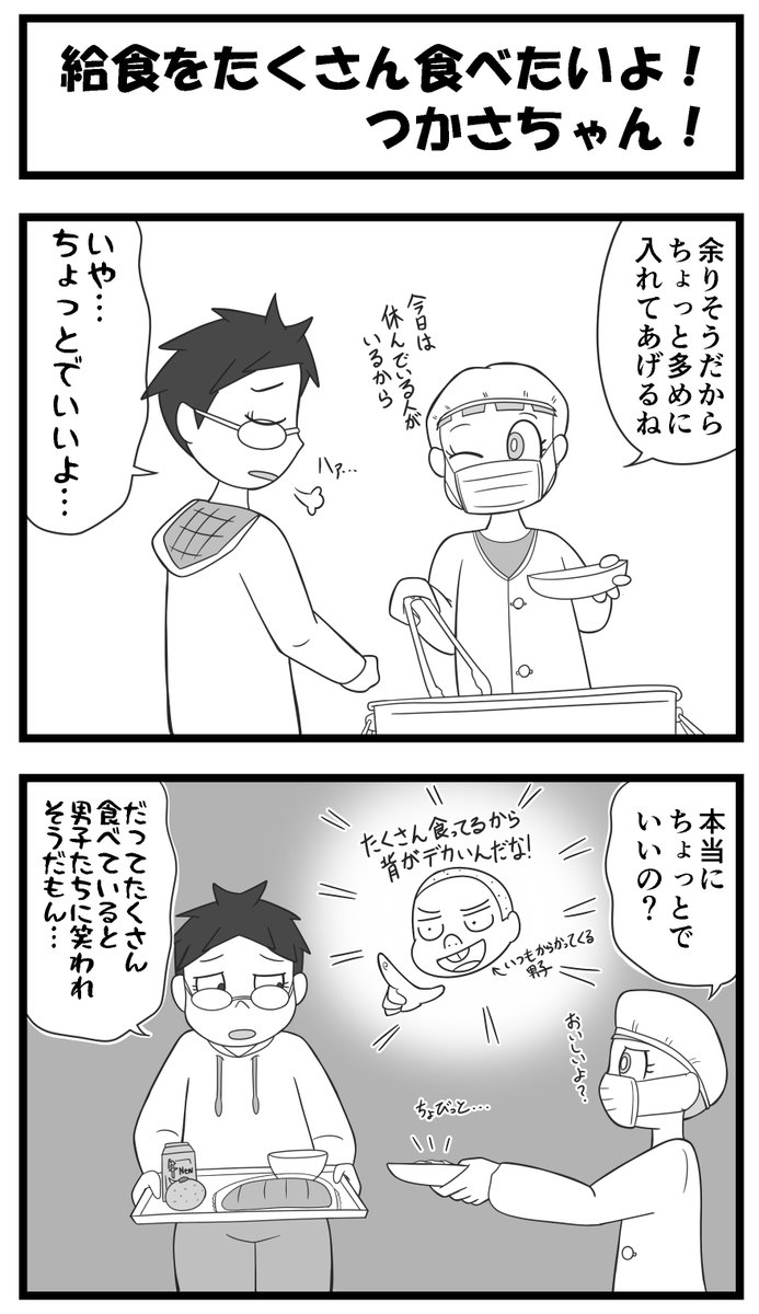 「給食をたくさん食べたいよ!つかさちゃん!」 #プラス思考のつかさちゃん #漫画が読めるハッシュタグ #5コマ漫画 #ポジティブ漫画 #給食