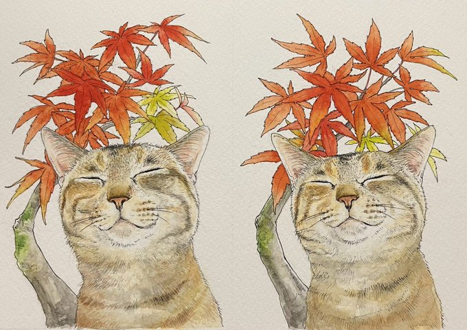 1 17 猫と紅葉。 ペン入れまで済ませた絵に何となくモヤモヤして、同じ構図で描き直した(でも先に描いてた絵も着色😂)ので、2つあります(笑) どちらが…お好き?|˙꒳˙) 描き手が良いと思ってても、周りの意見は違ったりするからなぁ。 #水彩画 #猫イラスト 22/08/27 18:53